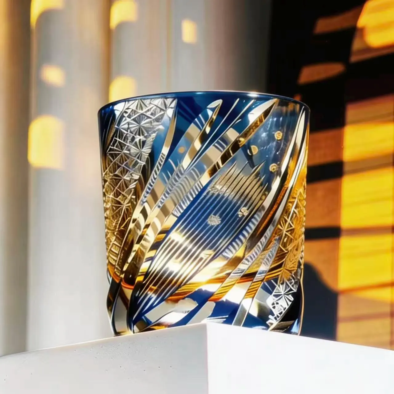 Blue Gold Swirl Edo Kiriko Whiskey Glass | Handmade Luxury Gift🎁