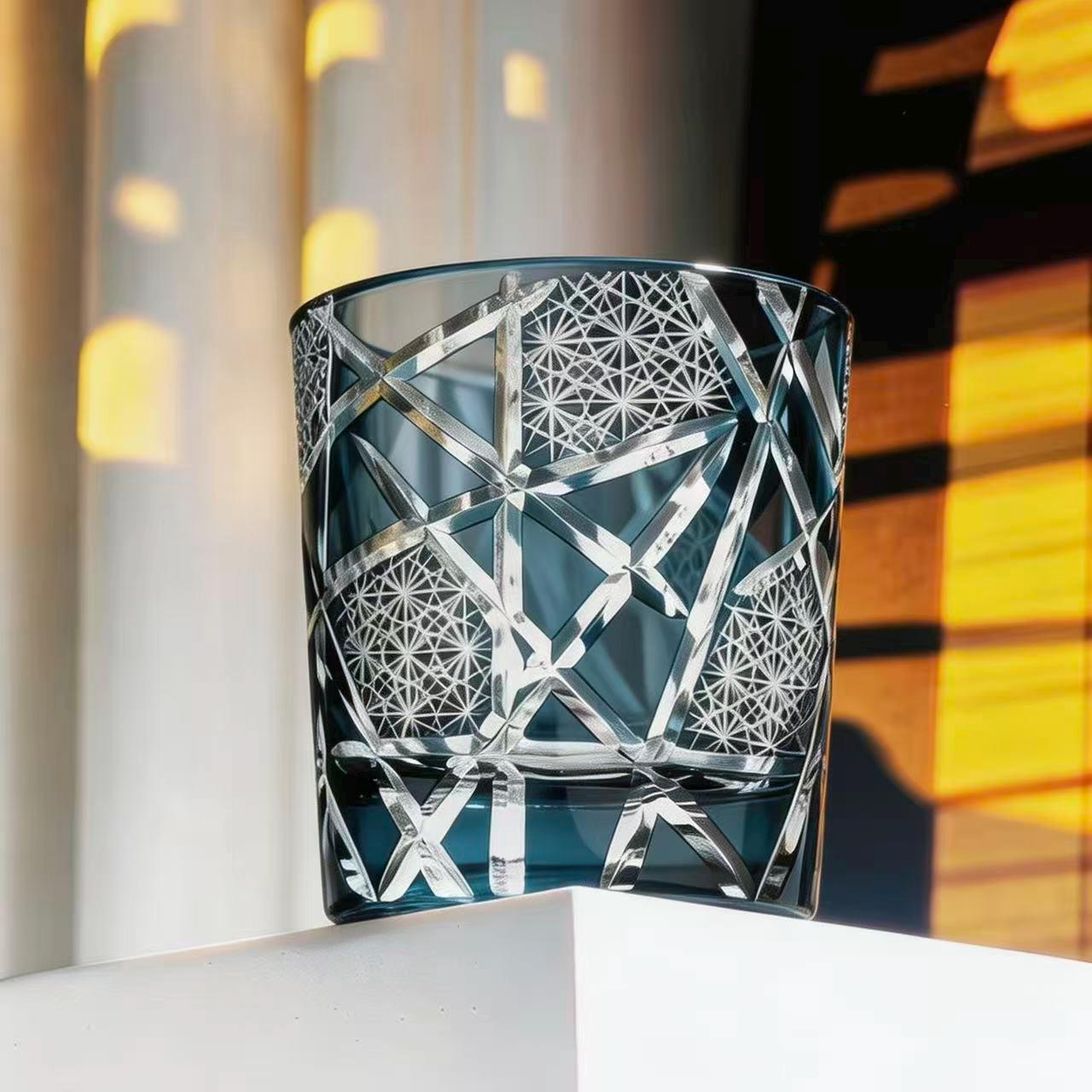 Deep Blue Geometric Crack Edo Kiriko Whiskey Glass | Luxury Handmade Gift