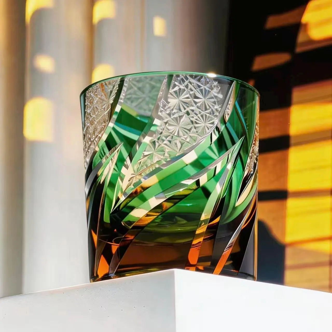 Green Edo Kiriko Whiskey Glass | Handcrafted Crystal Luxury Gift🎁