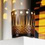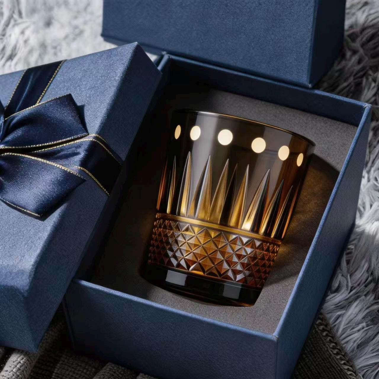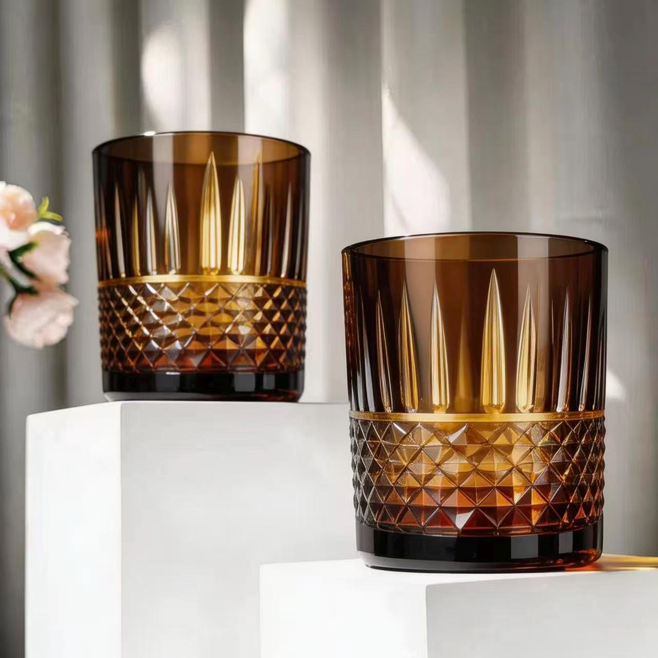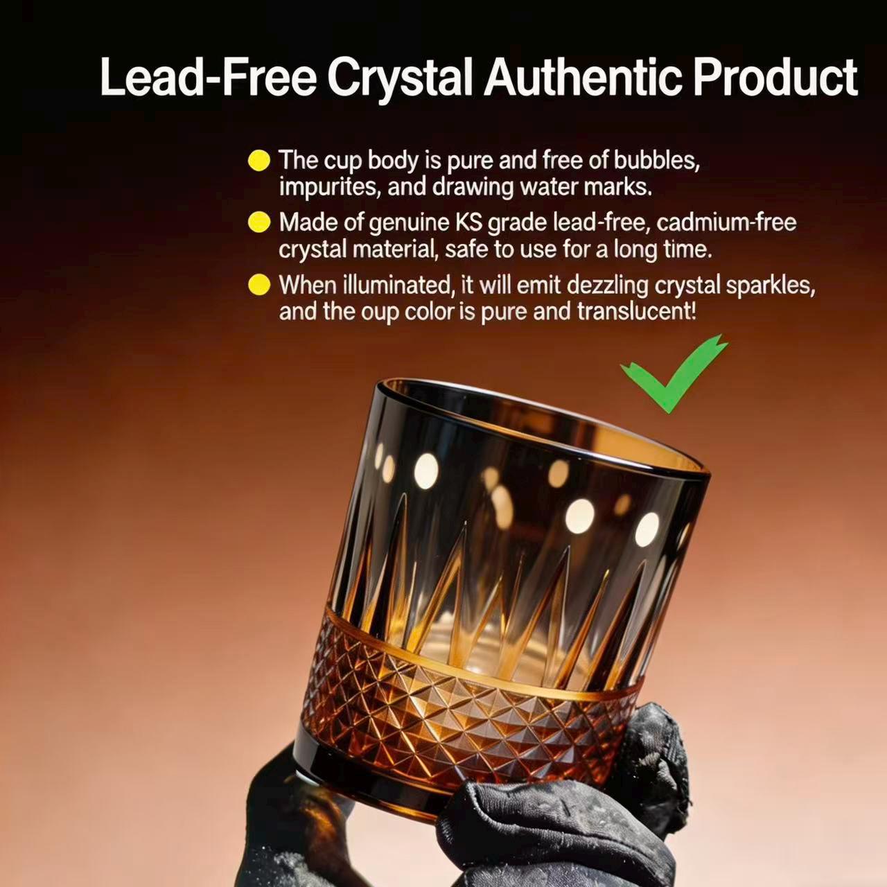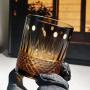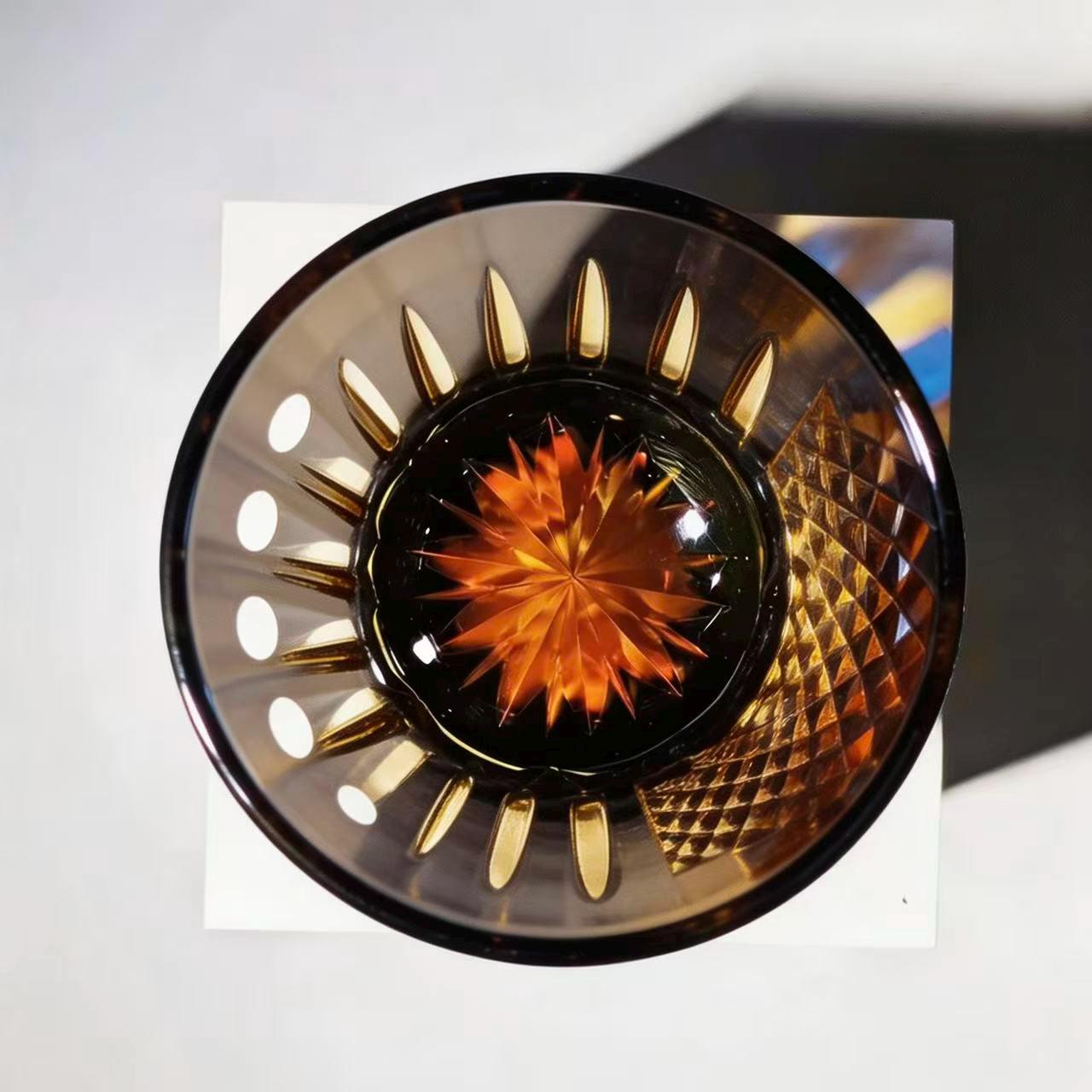 Inspired by the geometric precision of architectural spires and the structured elegance of woven lattice, our amber Edo Kiriko whiskey glass is designed to turn every sip into a moment of refined sophistication. Each piece is meticulously hand-carved with layered vertical spiked cuts and diamond-shaped patterns that catch and refract light, creating a dazzling, warm-glowing effect that highlights the rich amber hue of the crystal.