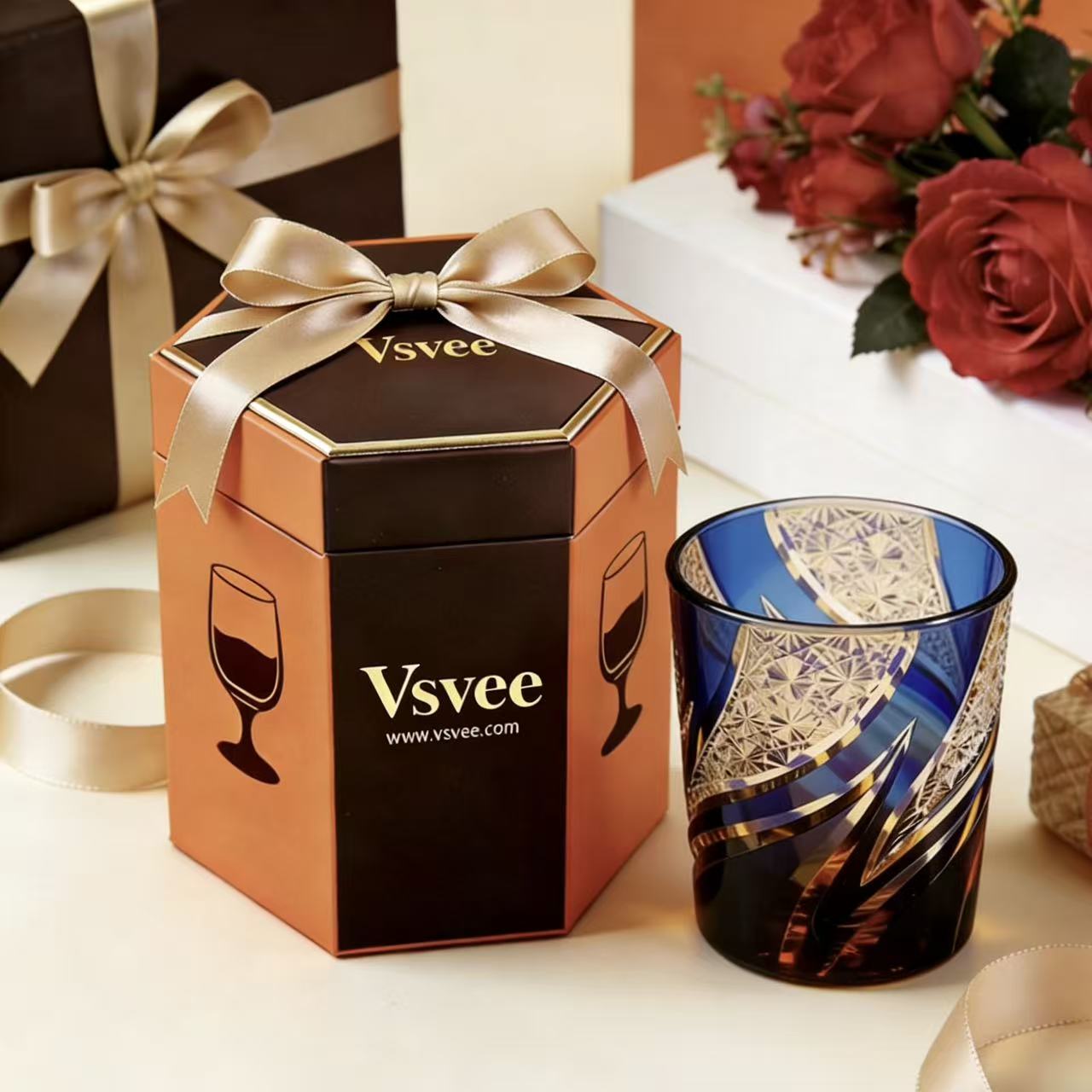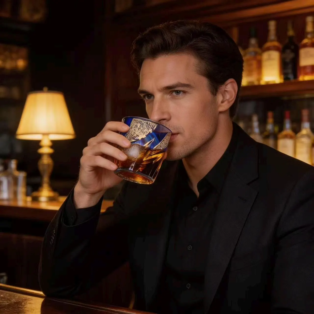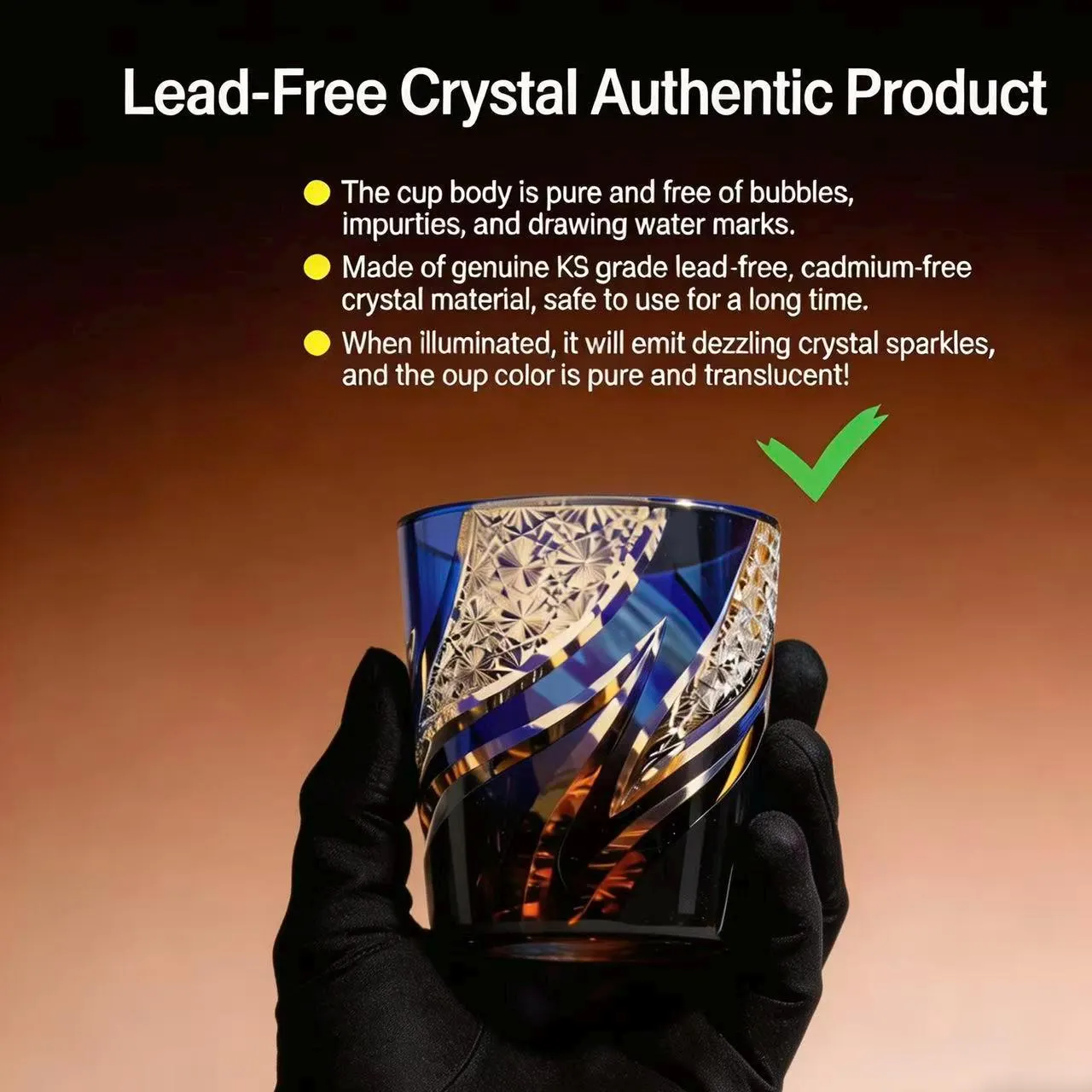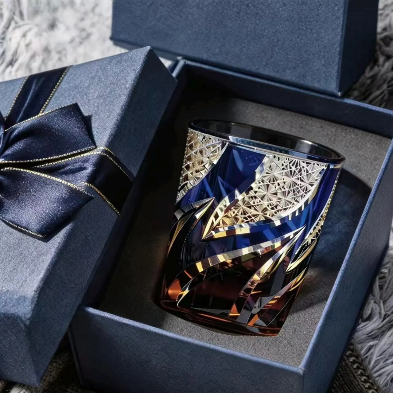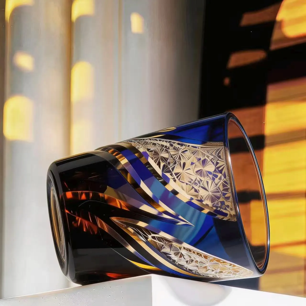 Inspired by the dynamic flow of ocean waves and the precision of traditional cut-crystal artistry, our blue gold Edo Kiriko whiskey glass is designed to turn every sip into a moment of aquatic elegance. Each piece is meticulously hand-carved with layered swirling linear cuts and star-web patterns that catch and refract light, creating a dazzling, golden-glowing effect that highlights the seamless deep blue to amber gradient of the crystal.