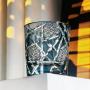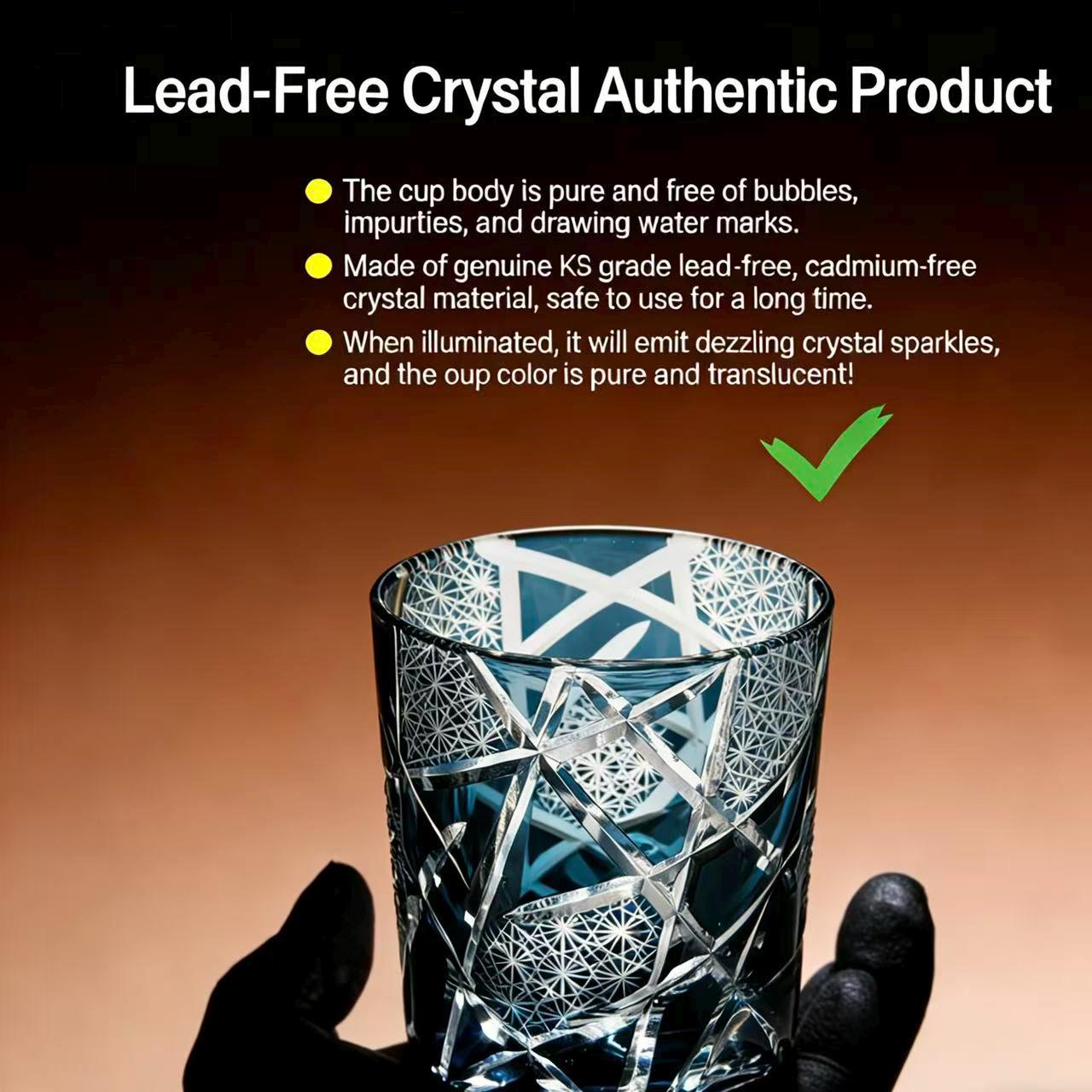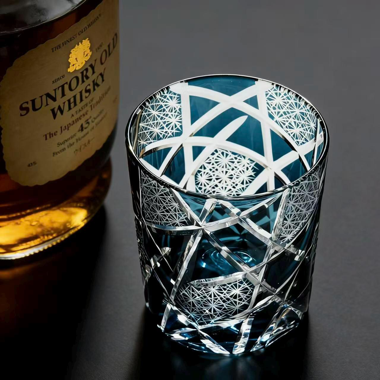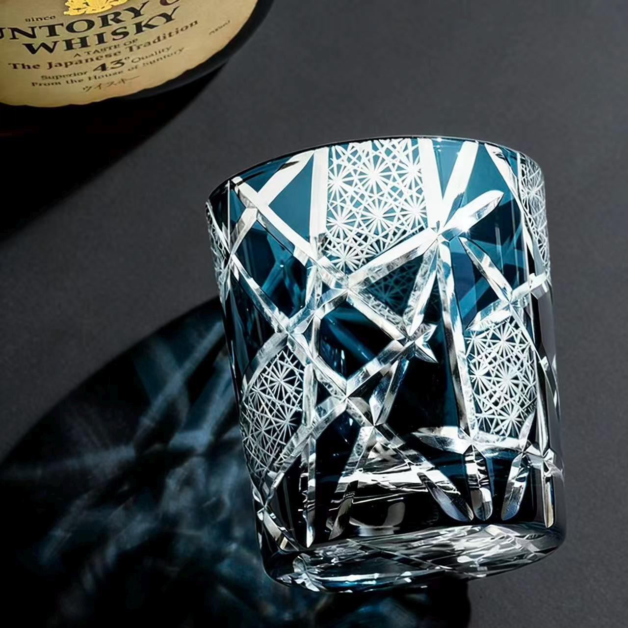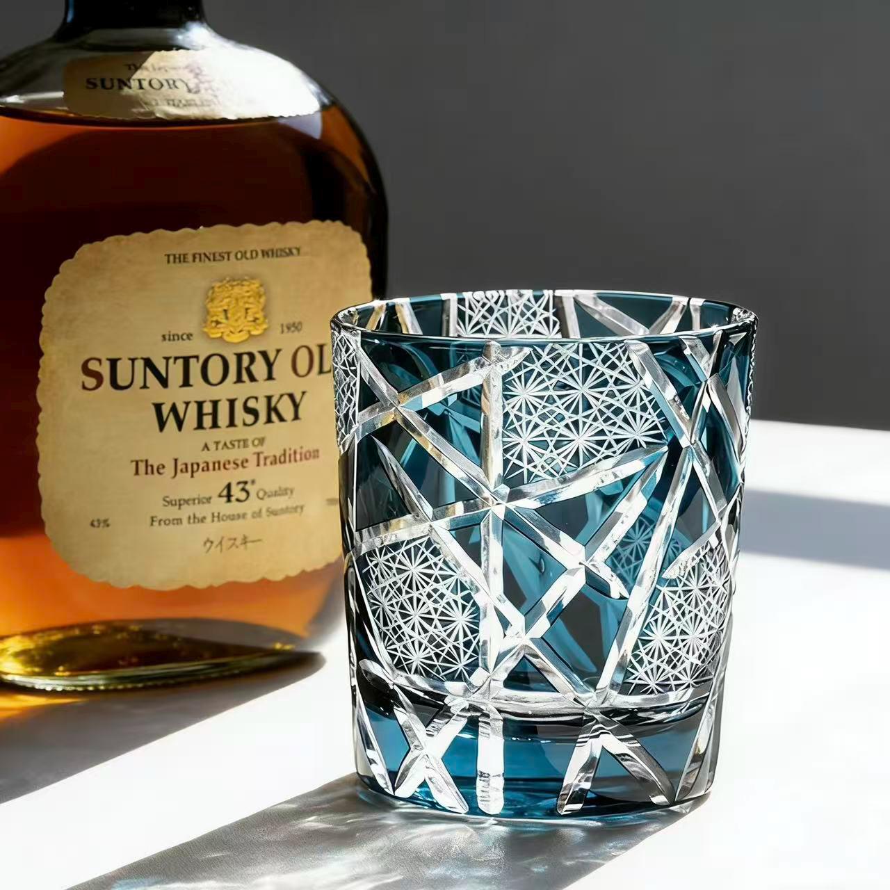 Inspired by the abstract beauty of cracked ice and traditional Edo Kiriko craftsmanship, this glass merges bold geometric lattice patterns with delicate crackled star motifs. Hand-carved details refract light into a brilliant, icy-blue glow against the deep teal crystal base, perfectly matching modern Western luxury bar aesthetics.