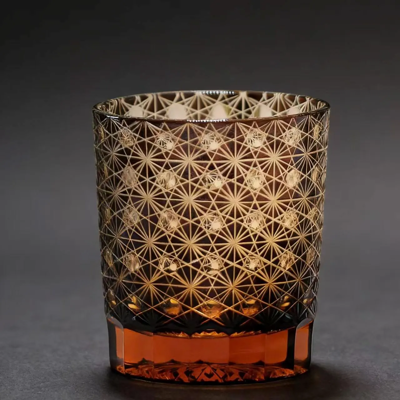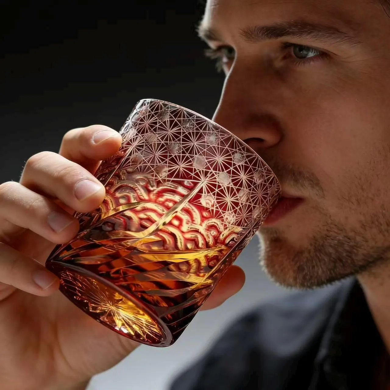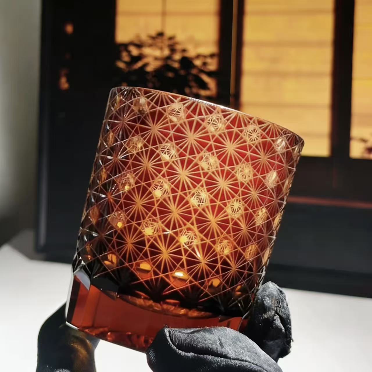 Inspired by the symmetry of sacred geometry and the warmth of deep crimson, this Edo Kiriko glass merges traditional hand-cut craft with modern Western boldness. The repeating star-web pattern refracts light into a luminous, fiery glow against the rich red crystal base, perfectly matching luxury home bar aesthetics.