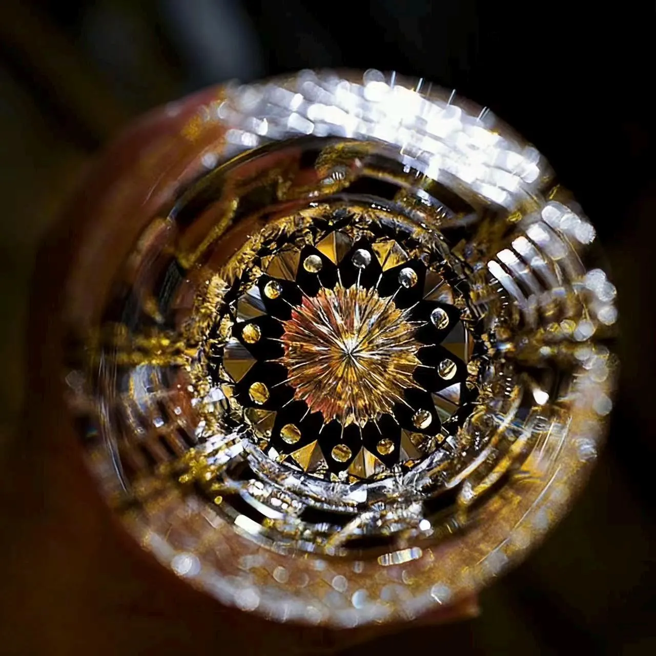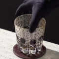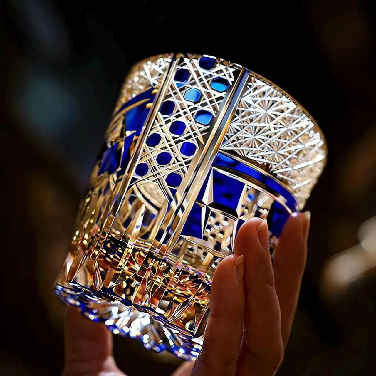 Inspired by sacred geometric patterns and traditional Edo Kiriko craftsmanship, this glass features a dense star lattice at the top, a bold hexagonal purple layer in the middle, and textured diamond facets at the base. Rooted in centuries-old Japanese glass-cutting art, the precise hand-carved details refract light into a warm, kaleidoscopic glow against the gradient gold-purple crystal base, blending Eastern heritage with opulent modern luxury.