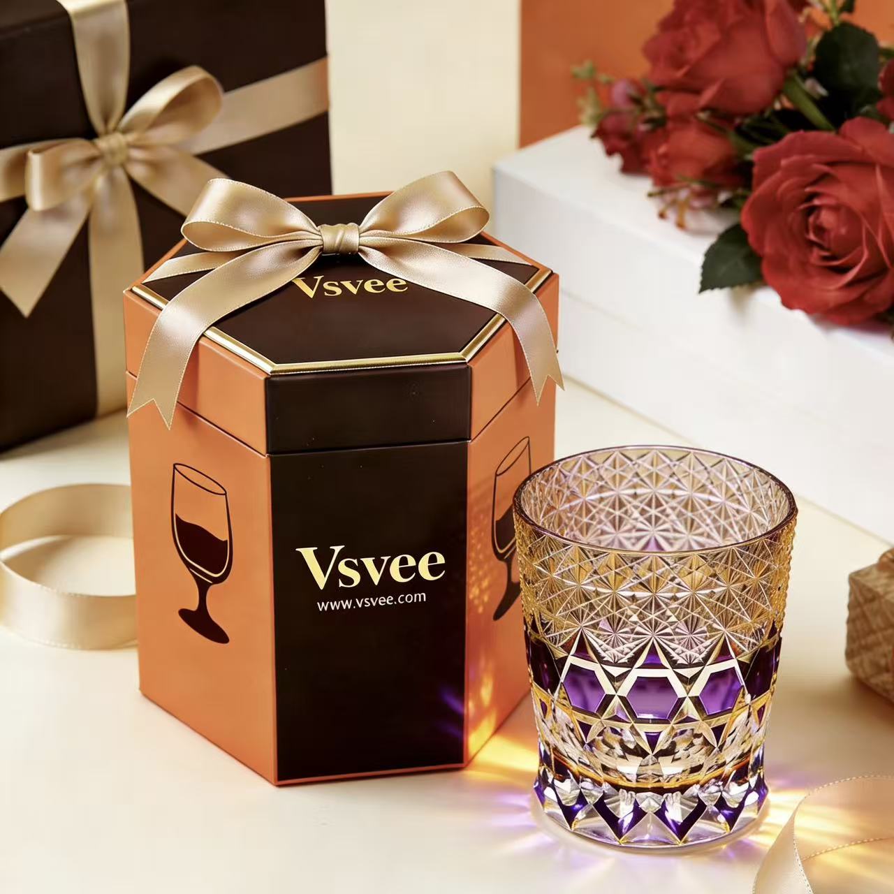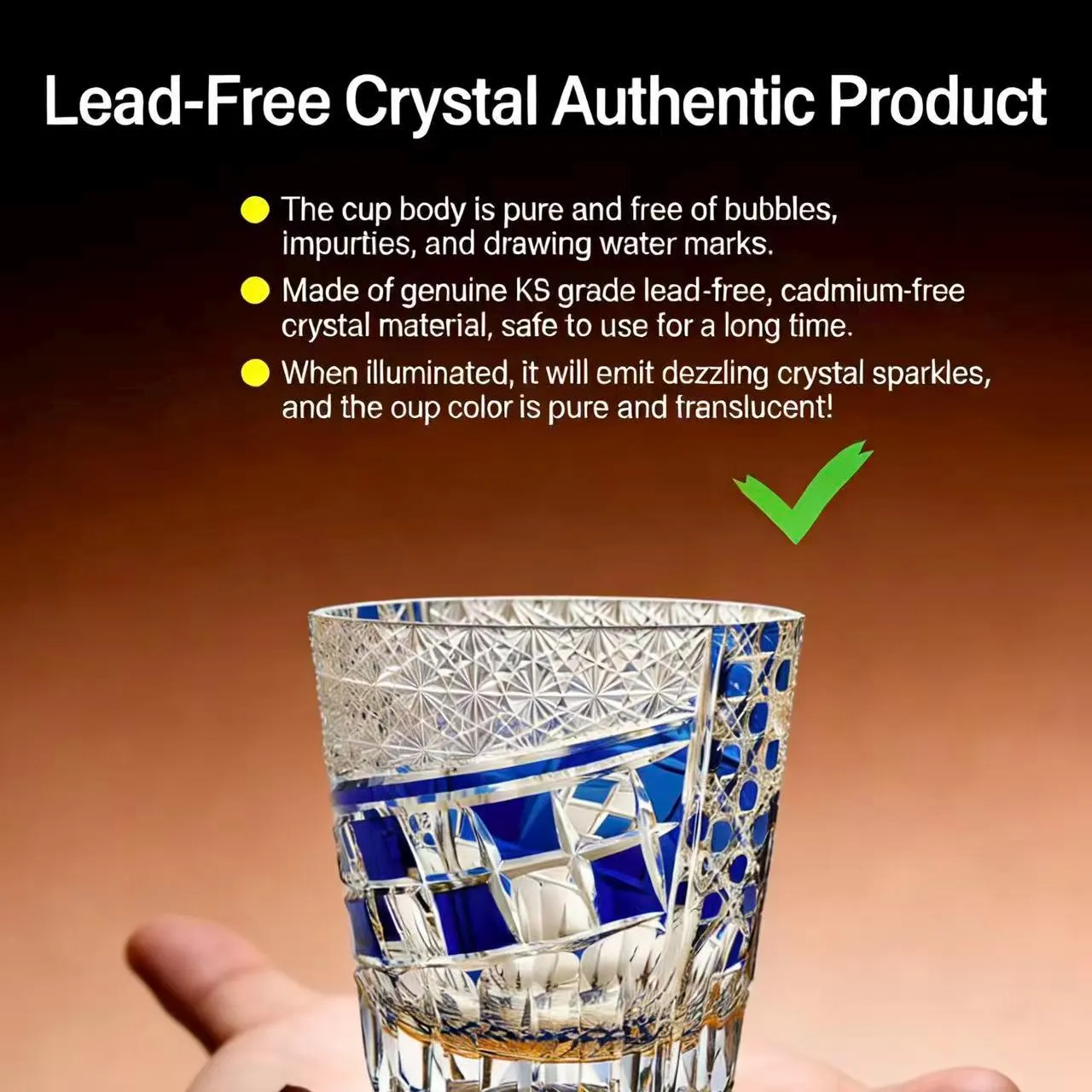 Every glass is meticulously hand-carved by skilled artisans using centuries-old Edo Kiriko techniques, where each star ray, hexagon edge, and diamond facet is shaped and polished by hand to reveal the gradient gold-purple layers beneath. No two pieces are identical, imbuing each with unique character and soul that stands apart from mass-produced drinkware, preserving the authentic spirit of traditional Japanese glass art.