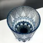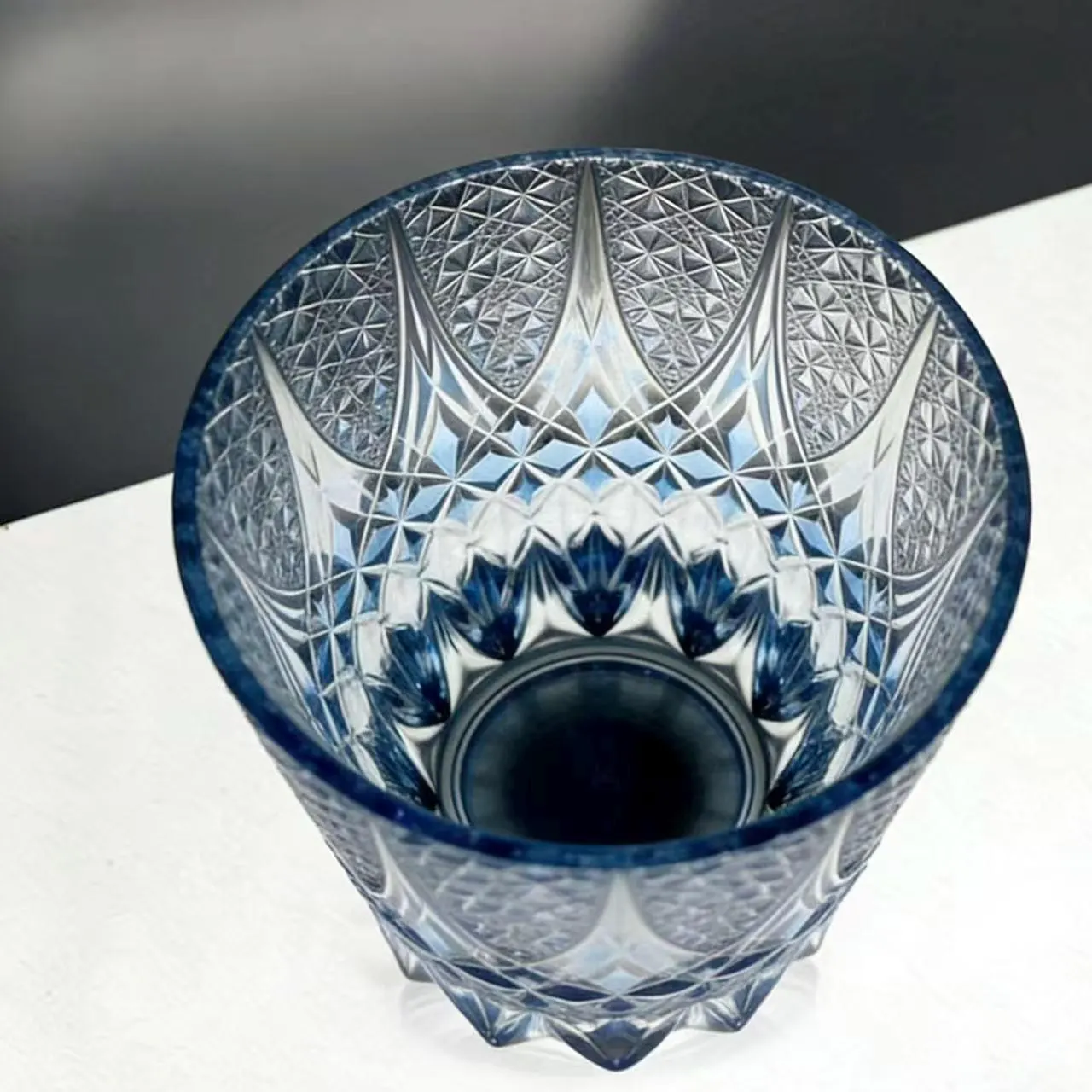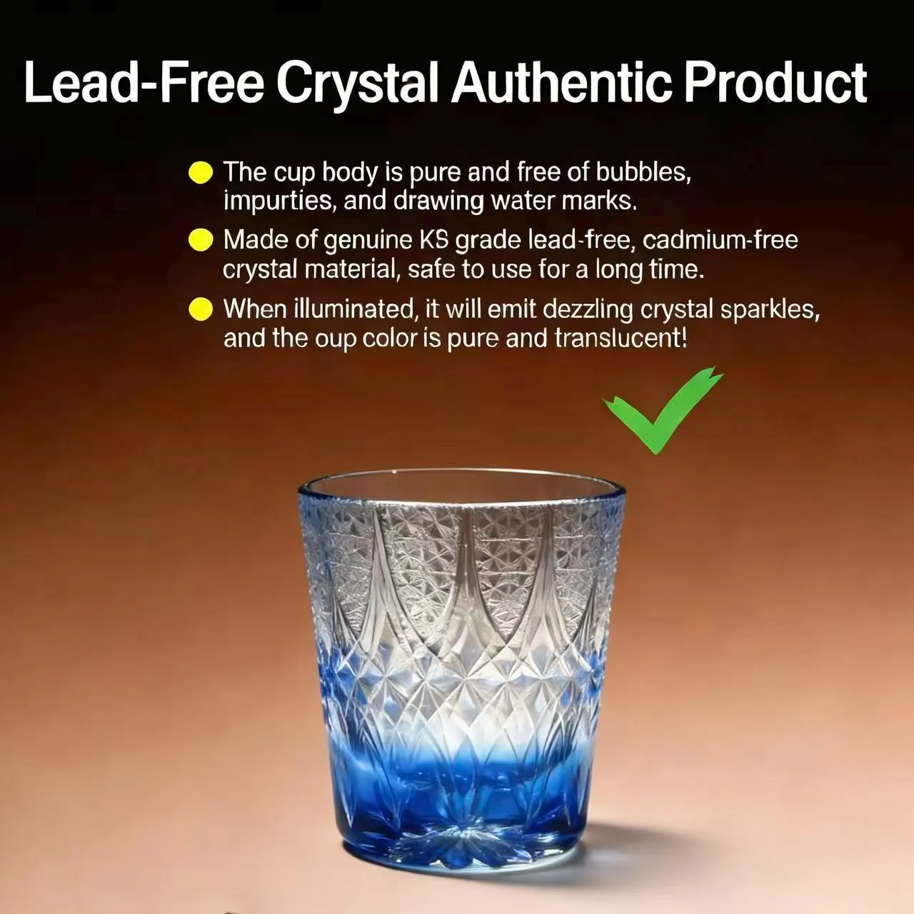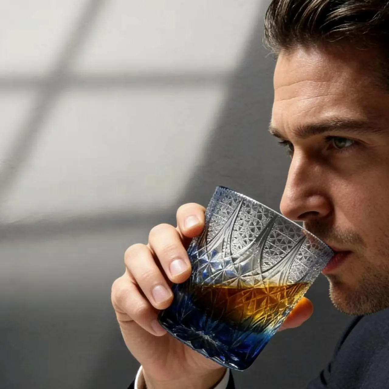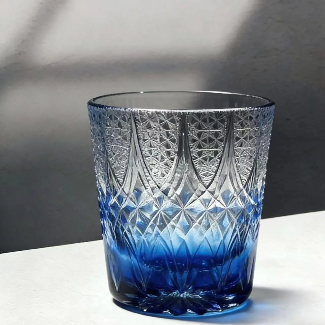Inspired by the glistening clarity of glacial ice and the precision of traditional cut-crystal artistry, this Edo Kiriko whiskey glass merges timeless craftsmanship with modern Western minimalist aesthetics. The upper section features delicate star-web patterns, while the lower half boasts bold ice-spike vertical cuts that refract light into a luminous, icy glow against the deep-to-light blue gradient crystal base. Every cut is hand-carved by skilled artisans, creating a striking contrast between the frosted star patterns and the glossy blue gradient—perfect for European and American consumers who favor refined, visually dramatic drinkware.