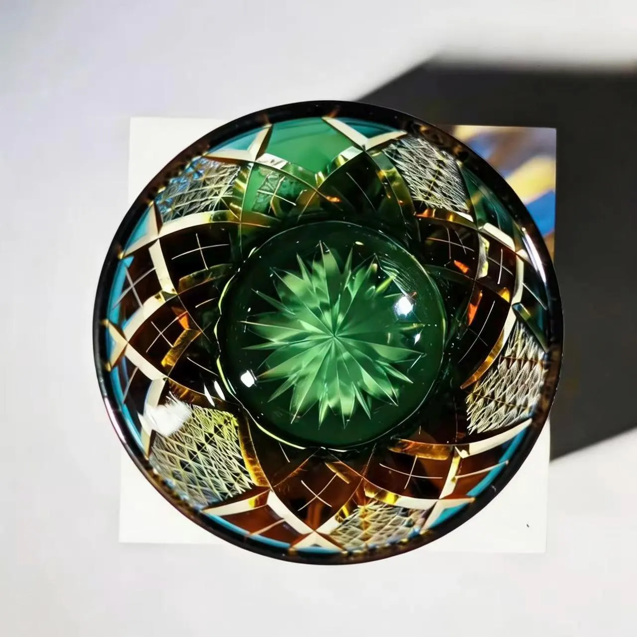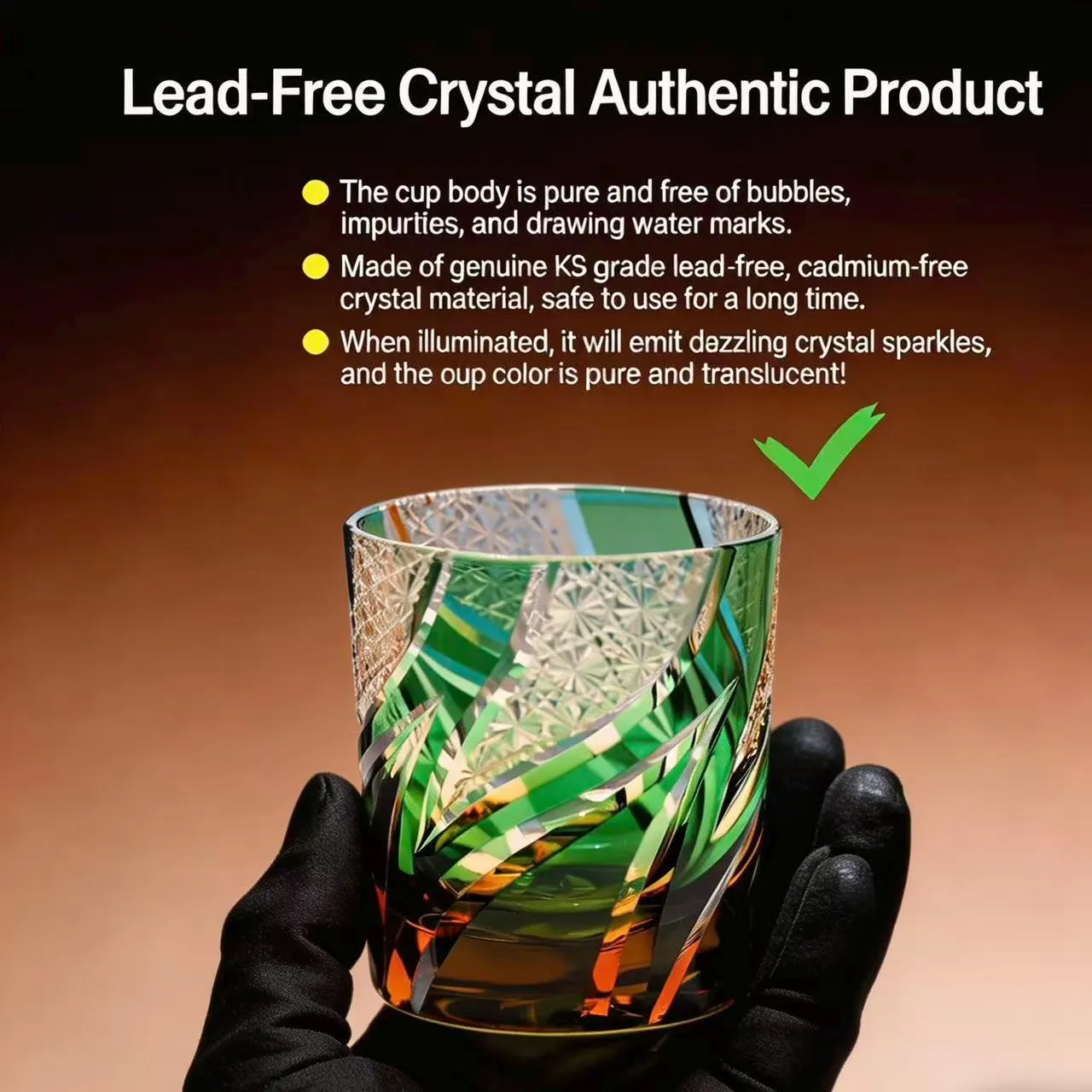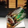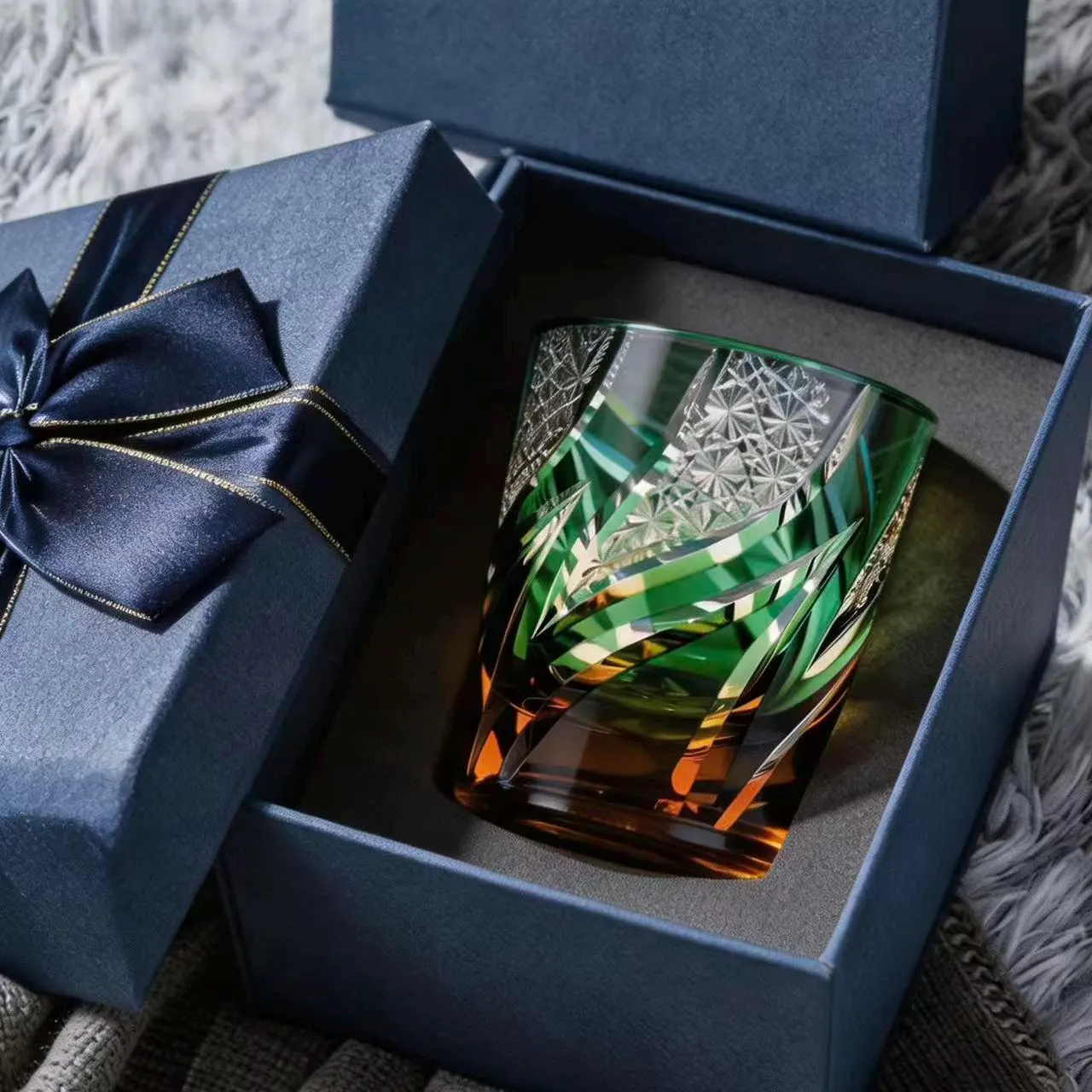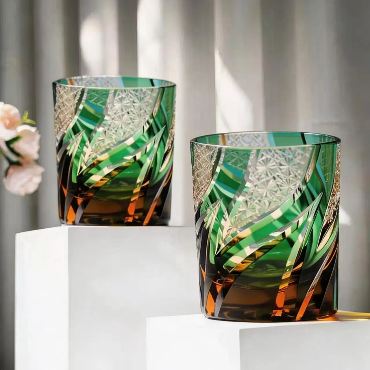 lnspired by the dynamic flow of natural foliage and the precision of traditional cut-crystal artistry, our green Edo Kiriko whiskey glass is designed to turn every sip into a luminous artistic moment. Each piece is meticulously hand-carved with swirling linear cuts and star-web patterns that catch and refract light, creating a dazzling, glowing effect that highlights the deep emerald hue of the crystal.