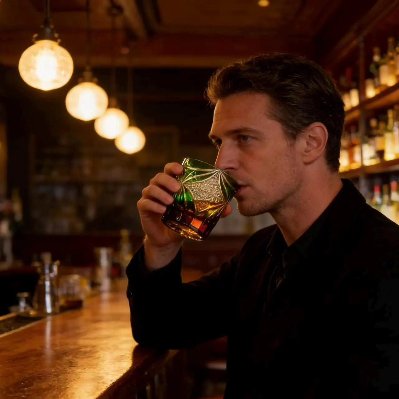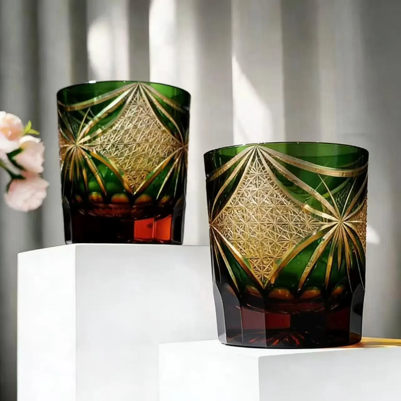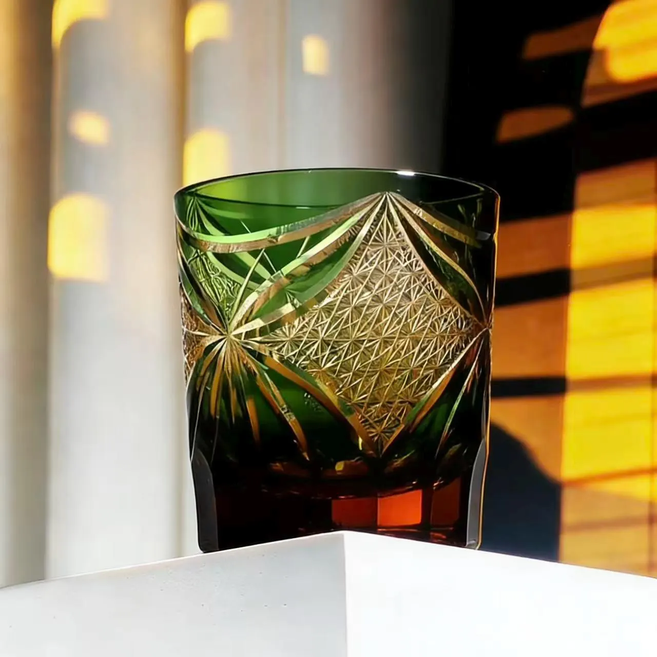 Green Star-Diamond Edo Kiriko Whiskey Glass | Handcrafted Collectible Tumbler