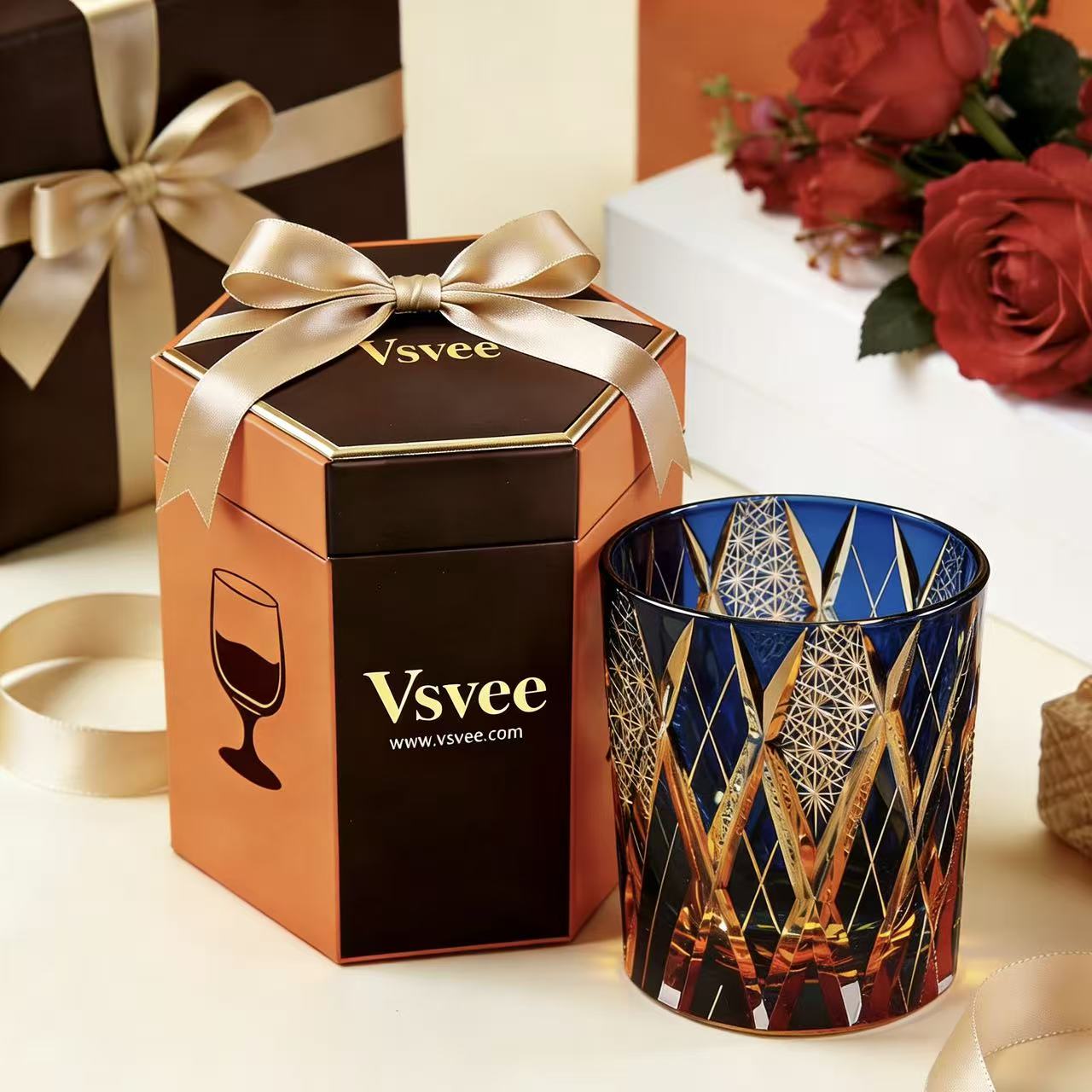Inspired by the geometric precision of woven latticework and the rich contrast of deep navy and amber tones, our Edo Kiriko whiskey glass is designed to turn every sip into a luminous artistic moment. Each piece is meticulously hand-carved with layered angular diamond cuts and star-web patterns that catch and refract light, creating a dazzling, warm-glowing effect that highlights the seamless navy-to-amber gradient of the crystal.