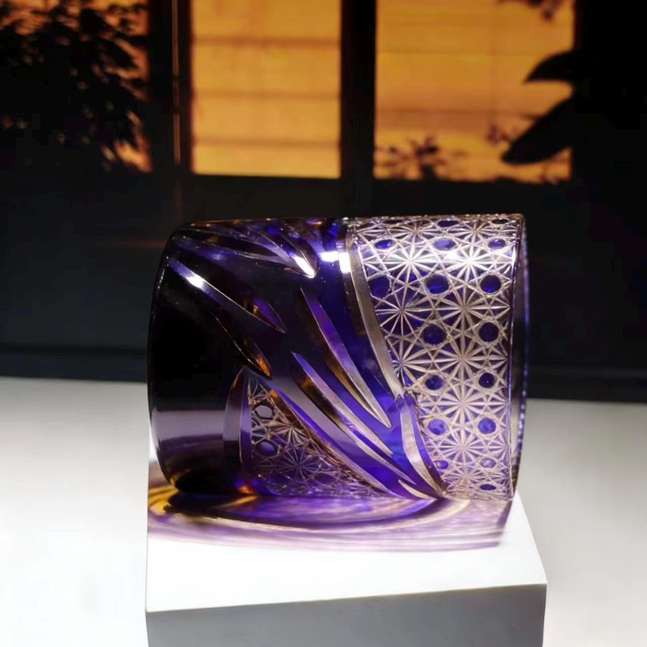 Inspired by the regal allure of amethyst and the dynamic flow of light, this Edo Kiriko glass merges bold swirling blade cuts with delicate star-web patterns. Hand-carved details refract light into a luminous, golden glow against the deep purple crystal base, perfectly matching Western luxury home bar aesthetics.