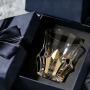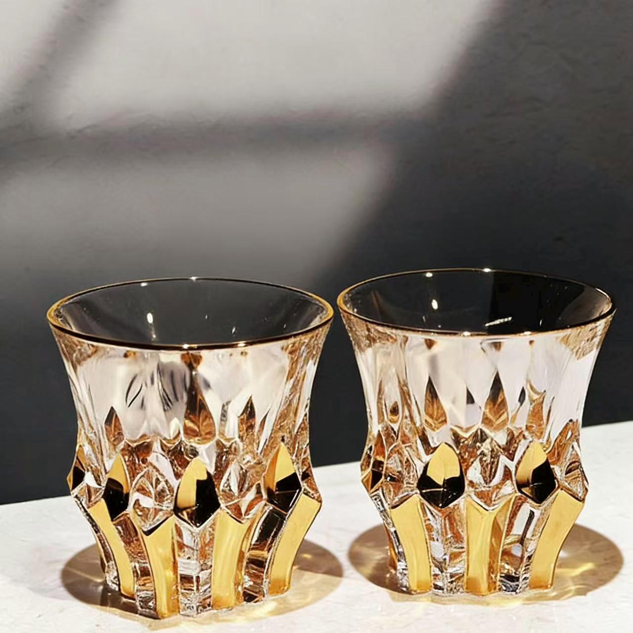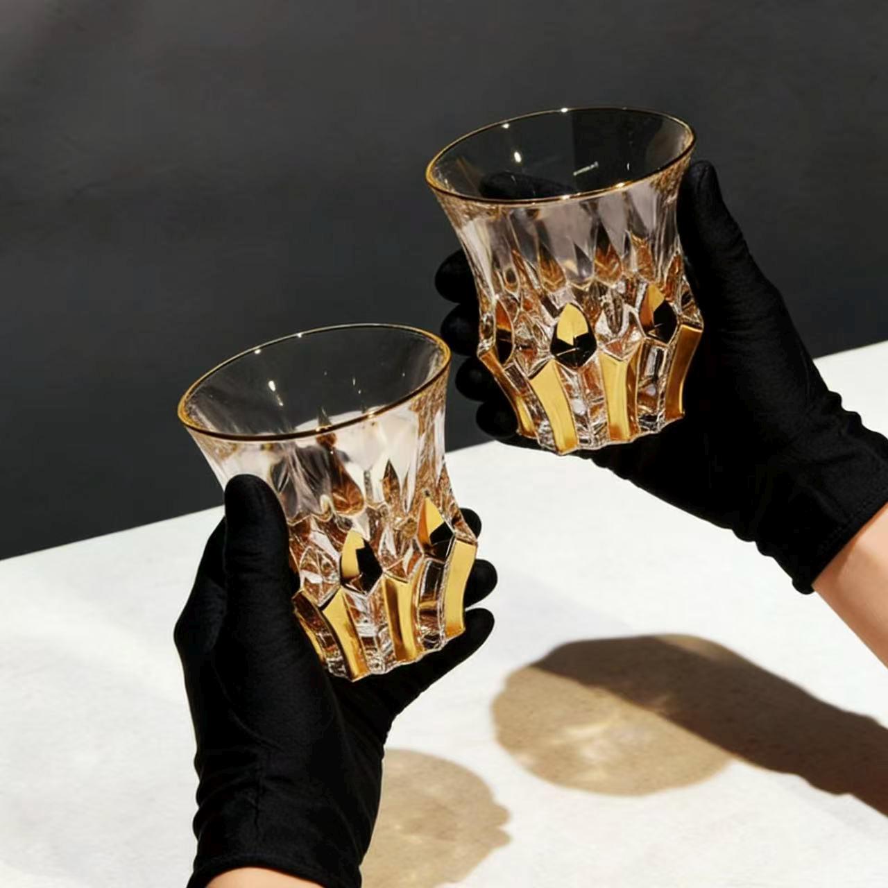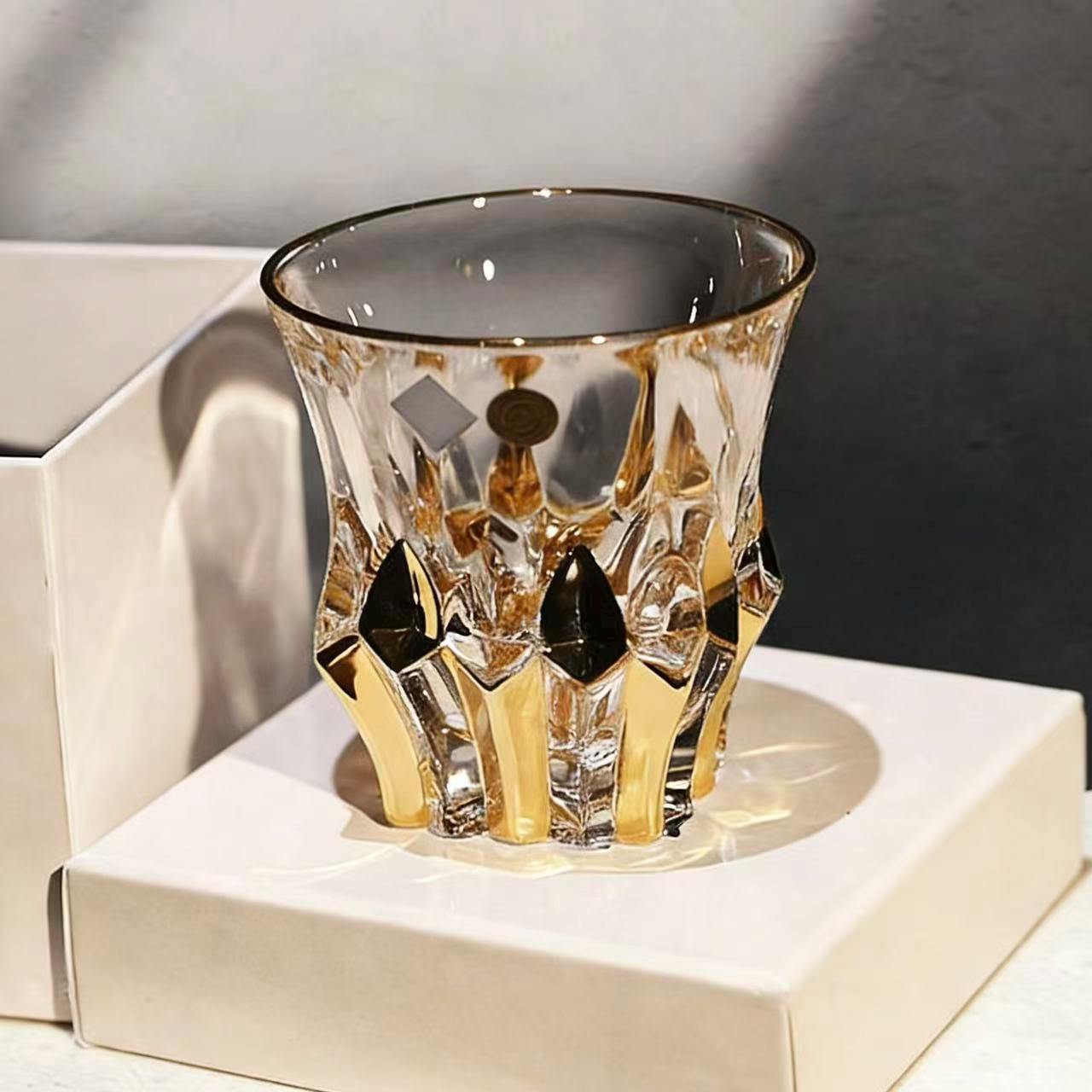 Inspired by the regal geometry of pyramids and traditional Edo Kiriko craftsmanship, this glass features bold black pyramid motifs and golden vertical accents. Hand-carved details refract light into a luminous, metallic glow against the clear crystal base, perfectly matching Western luxury home bar aesthetics.