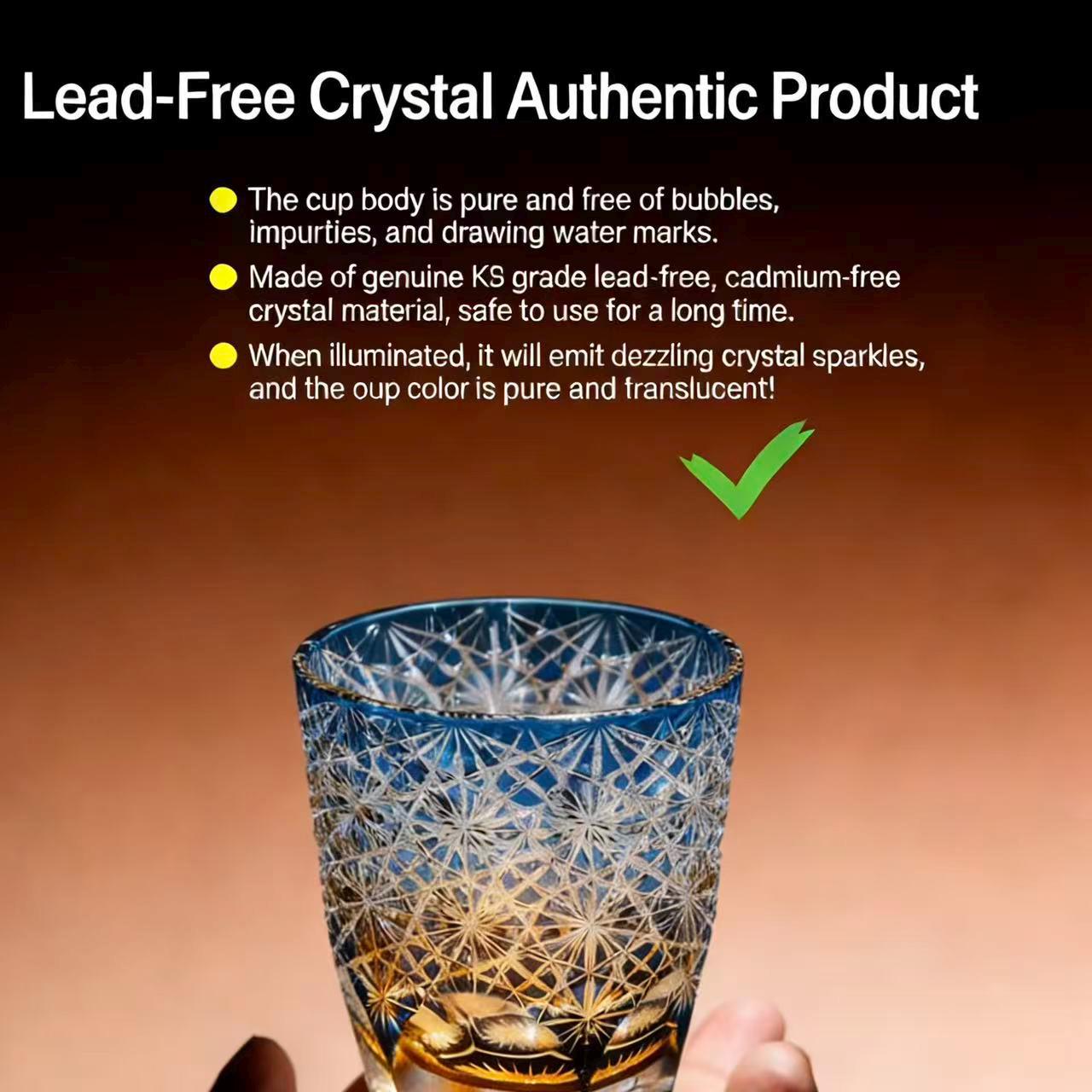 Inspired by the delicate geometry of star patterns and traditional Edo Kiriko craftsmanship, this glass features a dense star web pattern covering its body, paired with elegant petal-shaped cuts at the base. Rooted in centuries-old Japanese glass-cutting art, the precise hand-carved details refract light into a brilliant, warm glow against the gradient blue-amber crystal base, blending Eastern heritage with modern luxury home bar aesthetics.