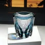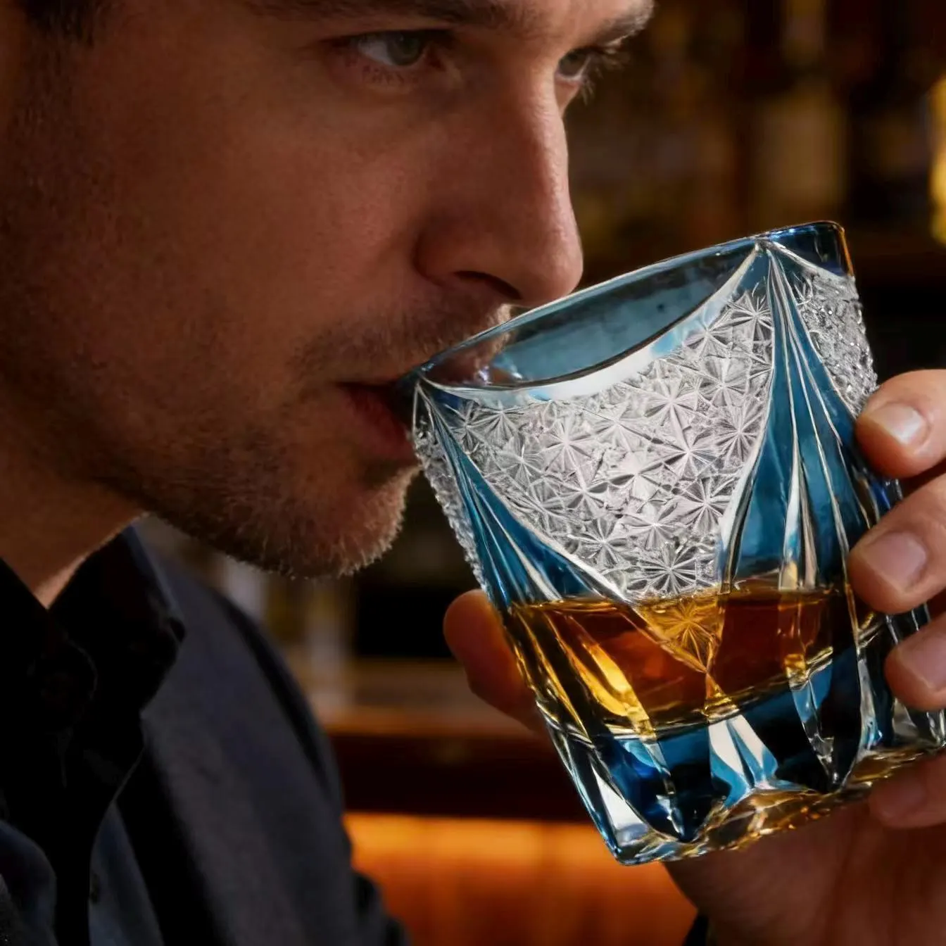 Inspired by the elegant shape of dracaena leaves and traditional Edo Kiriko craftsmanship, this glass features bold, flared leaf-shaped cuts that radiate downward, paired with a delicate star-web micro-pattern. Set against a deep sapphire blue crystal base, the precise hand-carved details refract natural light into a brilliant, cool-toned glow, perfectly blending Eastern heritage with modern luxury bar aesthetics.