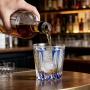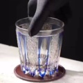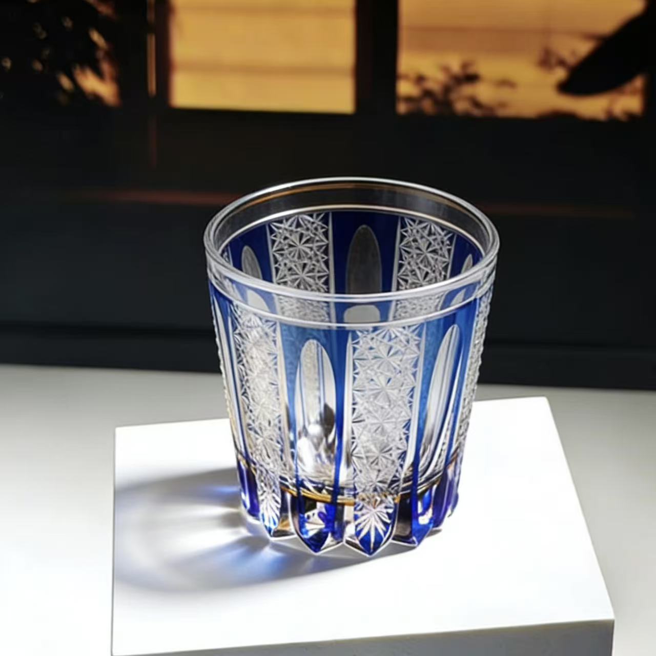 Inspired by the precision of traditional Japanese glass art and modern architectural lines, this glass features a delicate star web lattice interwoven with bold, elongated vertical fluted cuts, set against a deep sapphire blue crystal base. Rooted in centuries-old Edo Kiriko craftsmanship, the precise hand-carved facets refract light into a brilliant, icy-blue glow, blending Eastern heritage with modern luxury for the discerning home bar. The layered design creates a dynamic, three-dimensional effect that catches light from every angle.