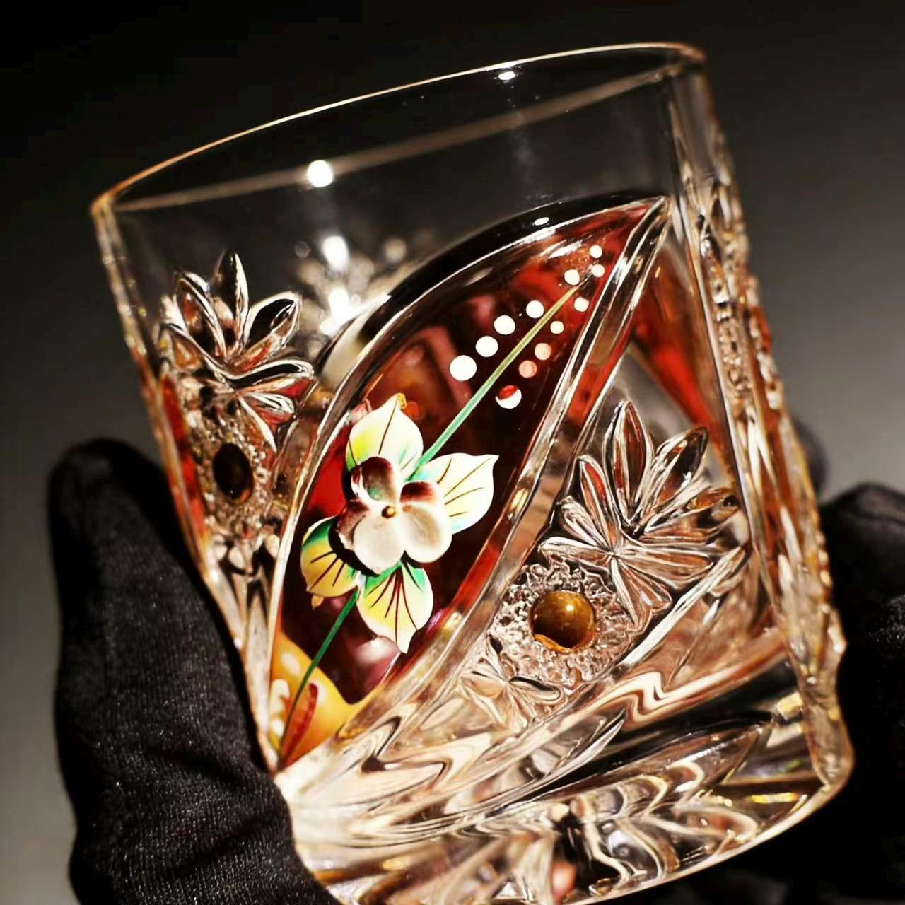 Inspired by the delicate beauty of floral blooms and traditional Edo Kiriko craftsmanship, this glass merges hand-carved leaf & star patterns with hand-painted enamel flowers. The vivid red background and colorful floral details refract light into a warm, artistic glow against the clear crystal base, perfectly matching Western luxury home bar aesthetics.