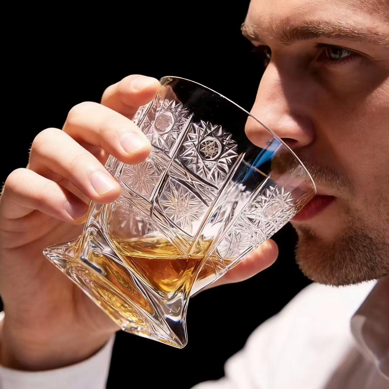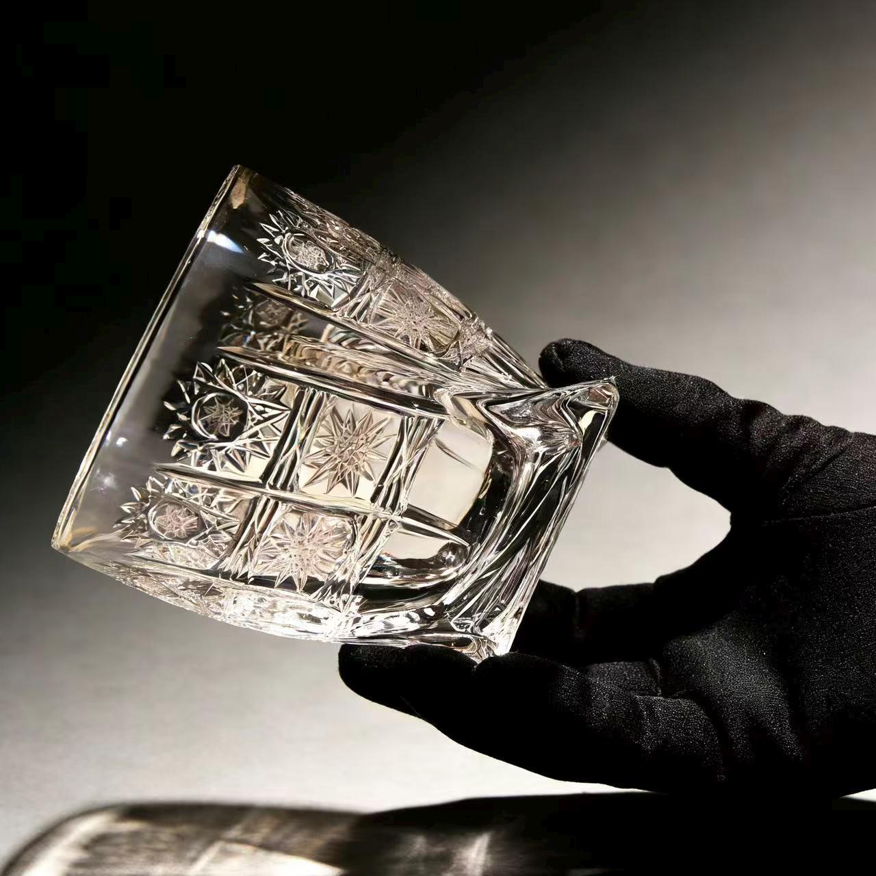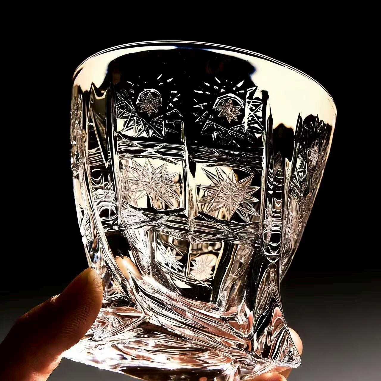 Inspired by the brilliance of starlight and traditional Edo Kiriko craftsmanship, this glass features a precise grid of hand-carved star motifs. Sharp angular cuts refract light into a brilliant, crystalline glow against the clear crystal base, perfectly matching Western luxury home bar aesthetics.