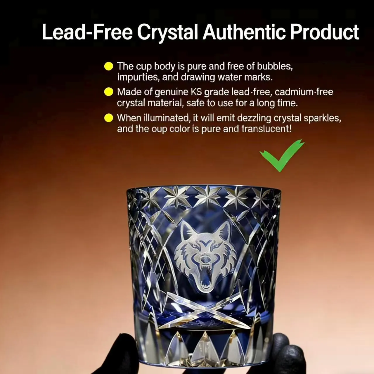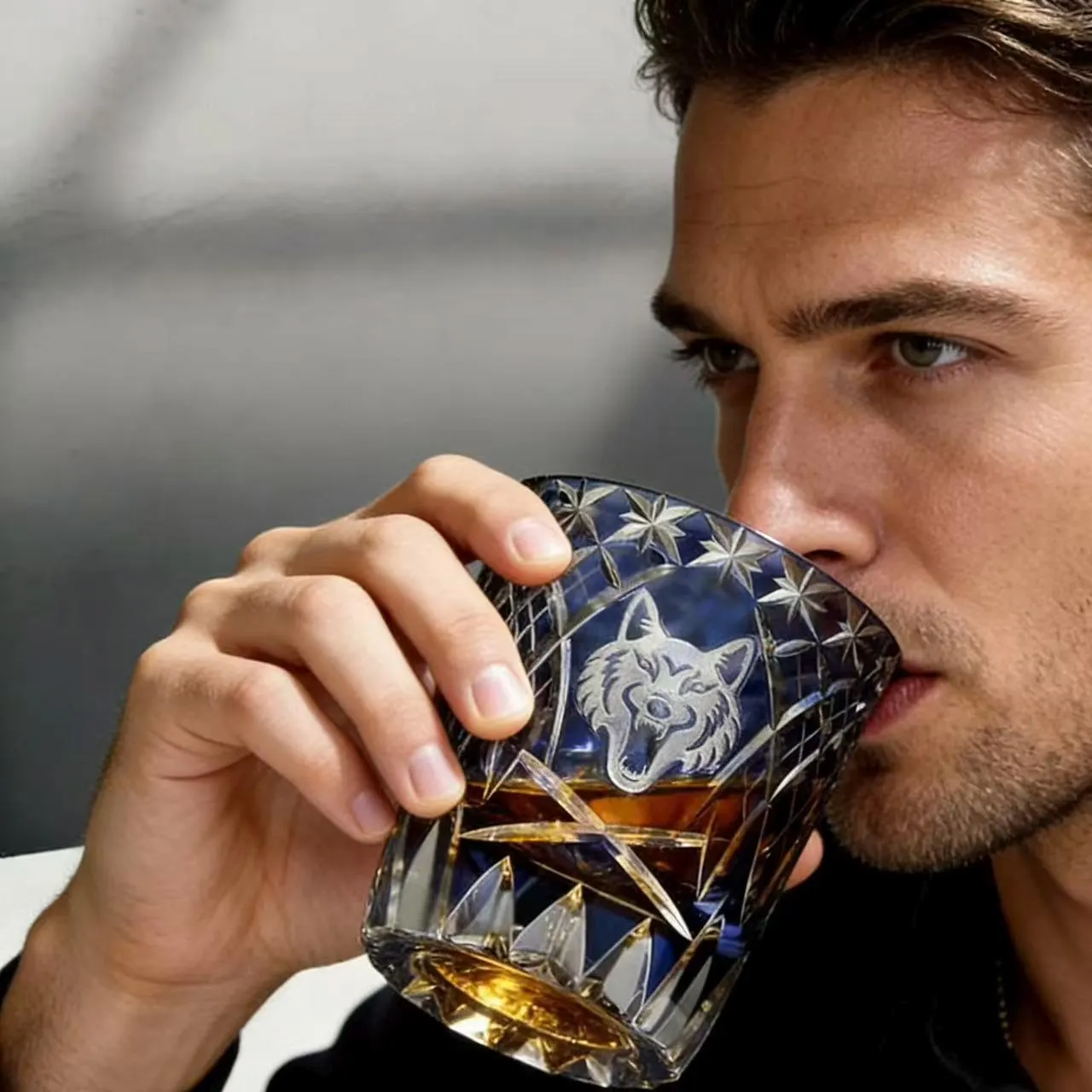 Inspired by the fierce spirit of the wolf and the precision of traditional cut-crystal artistry, this Edo Kiriko whiskey glass merges timeless craftsmanship with modern Western aesthetic sensibilities. The centerpiece is a hand-engraved wolf head motif, surrounded by delicate star patterns and interlocking diamond cuts that catch and refract light into a luminous, cool-toned glow against the deep blue crystal base. Every cut is meticulously hand-carved by skilled artisans, creating a striking contrast between the frosted wolf design and the glossy blue gradient—perfect for European and American consumers who favor bold, symbolic, and visually dramatic drinkware.