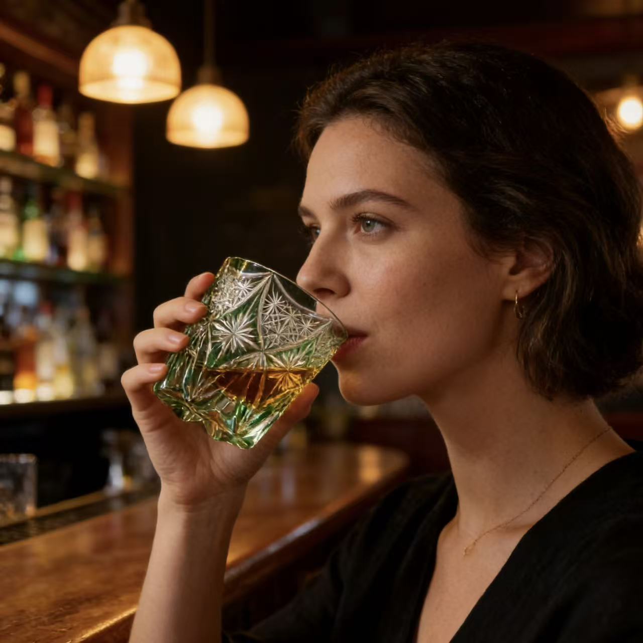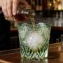 Inspired by flowing water waves and traditional Edo Kiriko craftsmanship, this glass features a delicate star web lattice framed by elegant curved wave accents, paired with bold radiating starburst motifs at the base. Rooted in centuries-old Japanese glass-cutting art, the precise hand-carved details refract light into a luminous emerald glow against the rich green crystal base, blending Eastern heritage with modern luxury home bar aesthetics. The layered, symmetrical design creates a dynamic, three-dimensional effect that catches light from every angle.