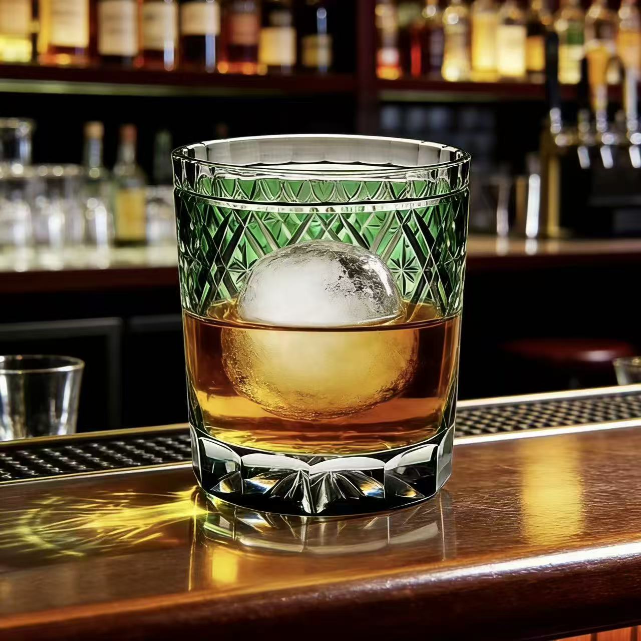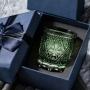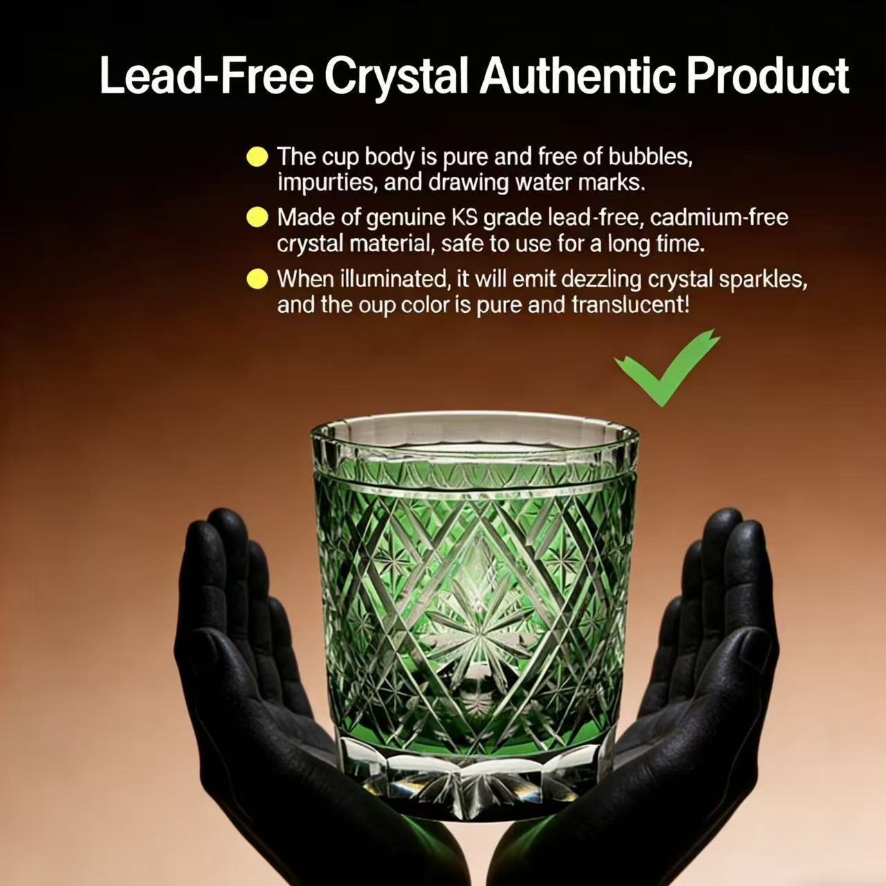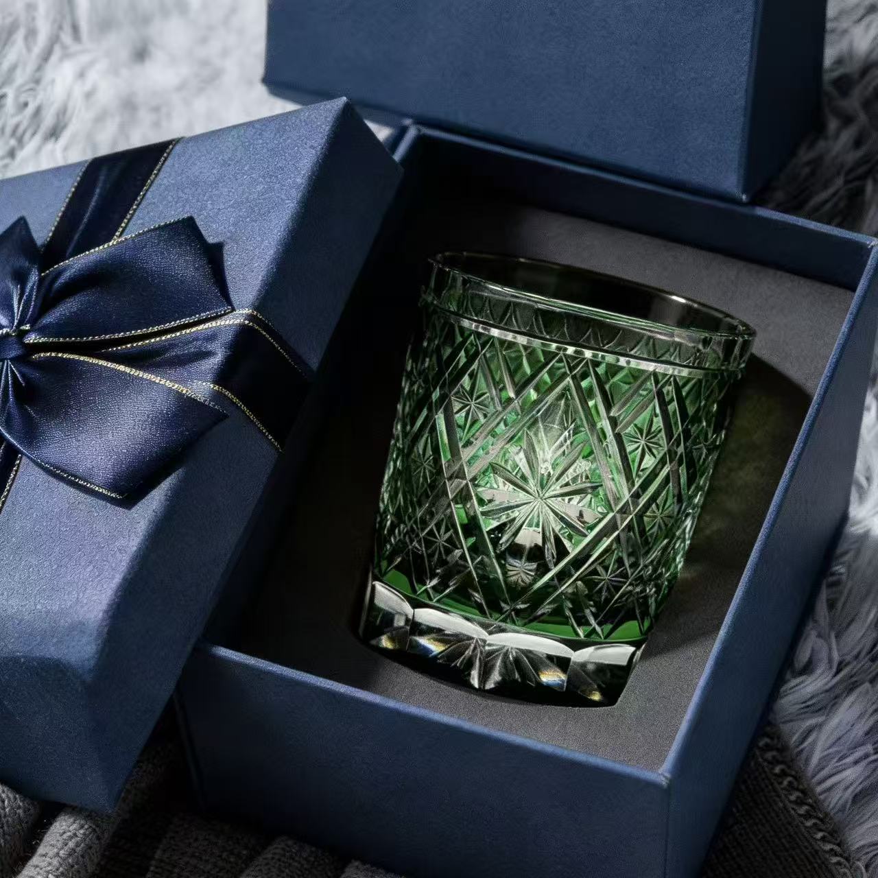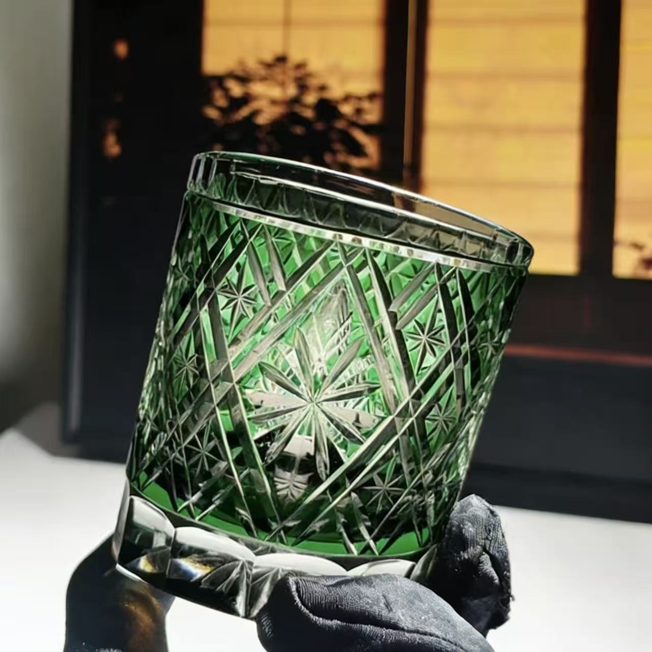 lnspired by the precision of geometric symmetry and the allure of emerald tones, our green Edo Kiriko whiskey glass is designed to turn every sip into a luminous artistic moment. Each piece is meticulously hand-carved with layered star-shaped and diamond-cut patterns that catch and refract light, creating a dazzling, glowing effect that highlights the rich emerald hue of the crystal.
