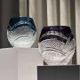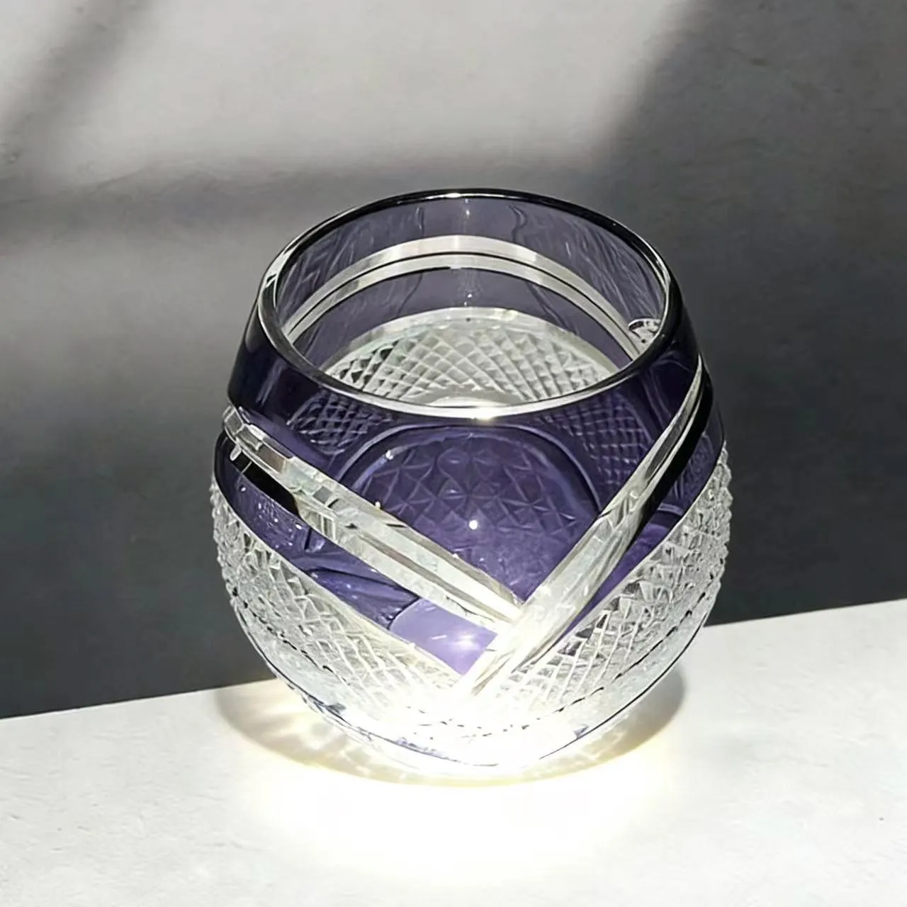 Inspired by the fluidity of spiral geometry and traditional Edo Kiriko craftsmanship, this rounded glass features bold intersecting spiral facets wrapping around its body, paired with delicate diamond grid textures. Rooted in centuries-old Japanese glass-cutting art, the precise hand-carved details refract light into a luminous, violet glow against the deep purple crystal base, blending Eastern heritage with modern sculptural luxury.